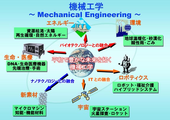 | 皆さんは機械という言葉から何を連想しますか?自動車,飛行機,コンピュータなど様々な製品が頭に浮かぶことでしょう!どれも間違いではありません. 確かに機械製品とい言って良いでしょう.科学技術には大きく分けてソフト技術とハード技術があります.ソフトという単語からゲームソフトやコンピュータのアプリケーションソフトという言葉が思い浮かぶように, ソフト技術は主に ”情報”をあつかう技術といえるでしょう.それに対し,ハード技術は正に”実体のある物”に関する技術といえます. 身の周りにある家電製品から人工衛星のような宇宙機器にいたるまでありとあらゆる “モノ”はハード技術とそれを制御するソフト技術の融合製品なのです.機械工学は特にハード技術に深く関係しています. 様々な「アイディア・機能を具現化する」つまり「仮想を現実のモノにする」ために必要な知識,それが機械工学です. ですから,材料の特性からその加工方法に至るまで“モノづくり”の全てをカバーします. | |